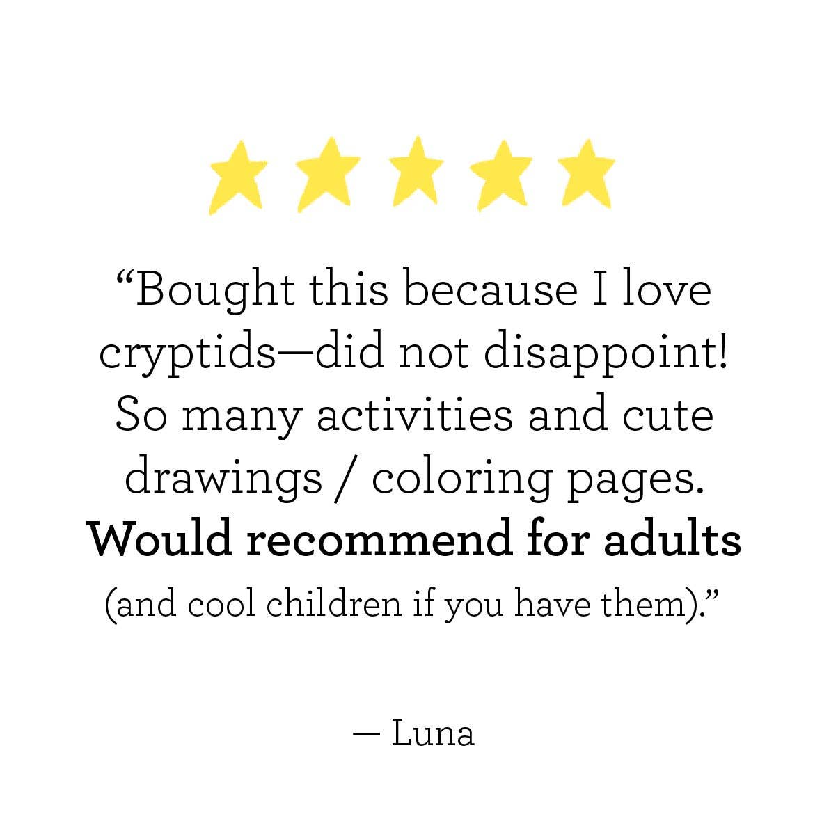 For true believers and skeptics alike, this book about CRYPTIDS is sure to suck you in (and legend has it, you may never return). Featuring well-known cryptids like Sasquatch and Loch Ness Monster, as well as lesser-known creatures like the Loveland frog! This Coloring and Activity book is unlike anything else out there, and kids and parents can tell the difference! - Full of JOKES that keep kids laughing. - Packed with FUN FACTS that keep kids turning pages. - A unique VARIETY of activities engage different parts of the brain, holding kids' attention for longer. - Works for a BROAD RANGE of ages. Even PARENTS have enjoyed doing the activities! - Activities strike the right balance between challenging and doable, which makes them VERY REWARDING! These creative activities and fun-fact coloring pages relieve stress and hold your attention. Release endorphins as you solve the puzzles and LAUGH as you discover the unexpected answers! Ages 8 and up!